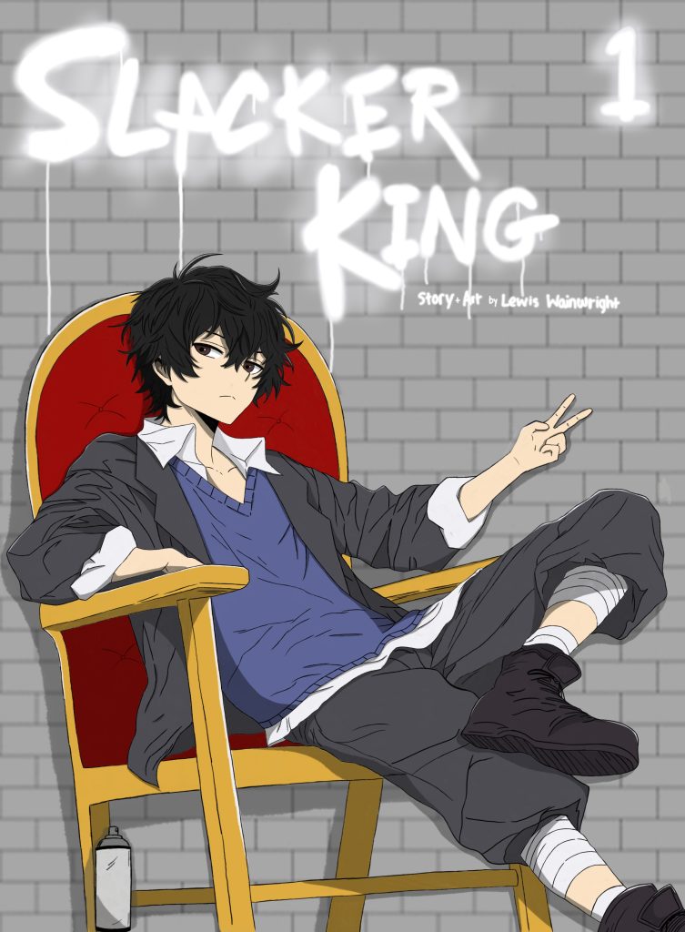 The first cover I created was the one titled “Slacker King” and its genre is comedy/ school. It’s about a high school student called Rika who is insanely strong but very lazy and the delinquent students notice how strong he is when he is forced into a fight by accidentally bumping into another student. The cover includes a conceptual title which has been spray painted on the brick wall background and includes drips for a more realistic effect. The royal looking chair hints to the fact Rika is seen as the king of the delinquents even though he didn’t mean to do it.