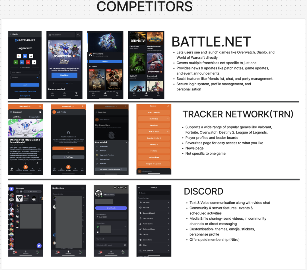 To help shape the features and aesthetic of Watchpoint, I conducted competitor research by exploring apps and platforms with strong ties to gaming communities. Battle.Net, TRN, and Discord each offer a valuable insight into how social features, stat tracking, and user engagement are handled in an app.