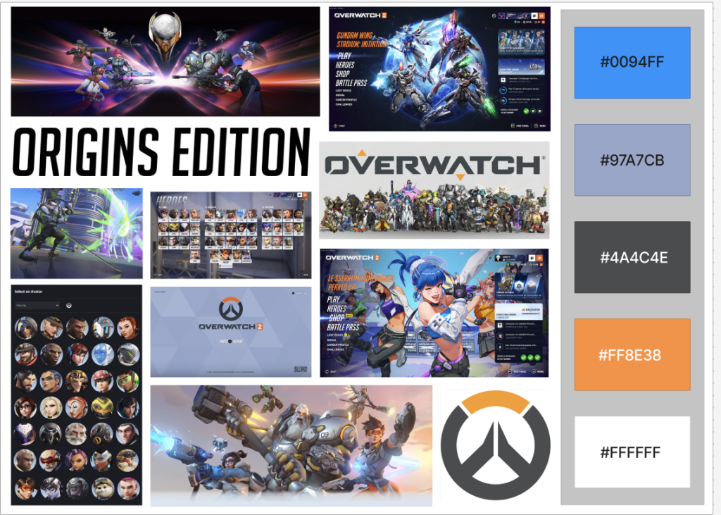 I created this mood board that captured the essence of the game. The colour palette I chose was directly inspired by Overwatch’s branding, which features a bold combination of blues, greys, orange and white. The blue and grey tones offer a sleek, tech feel, while the orange and white adds vibrancy and is going to be used to highlight text and call- to-action buttons. When using a complementary scheme, it is important to choose a dominant colour and use its complementary colour for accents (Babich, 2017).