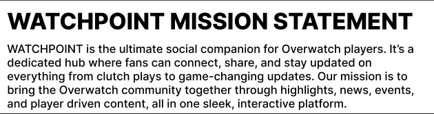 This blog post will focus on the design, research, and ideation process behind the creation of Watchpoint. This is a companion social hub app designed for the popular team-based shooter Overwatch, developed by Blizzard Entertainment. Watchpoint will be developed with both UI (User Interface) and UX (User Experience) principles in mind, ensuring the final product is not only visually engaging, but accessible, and enjoyable for Overwatch players of all skill levels.