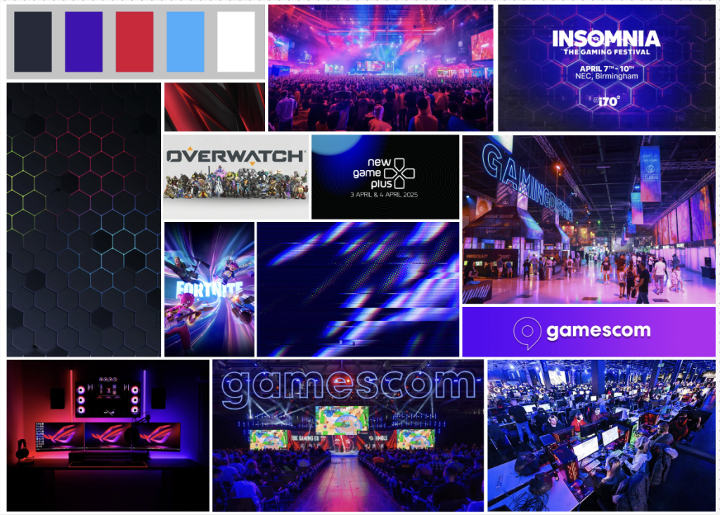 A detailed mood board was created to explore and define the visual direction, aesthetics, typography styles, and design inspiration shown from competitor gaming festivals. This helped establish a strong foundational understanding of the current industry standards while also identifying opportunities to differentiate from them. The mood board includes a selection of images taken at various gaming festivals, showcasing vibrant colours, and capturing the glowy aesthetic that’s often associated with gaming events. One of the most prominent design elements within these visuals is the use of hexagonal patterns, which help create a modern, tech-inspired feel. While I like the idea of hexagonal patterns and how they contribute to that futuristic vibe, I’d like to experiment with creating something different for my own branding.