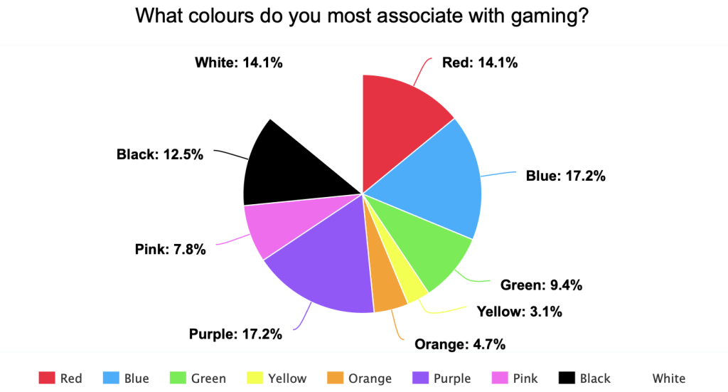 To help guide the colour palette for the website and overall branding, I collected user feedback by asking what colours they most associate with gaming. The responses were shown using a pie chart, which revealed that the most popular choices were blue, purple, red, black, and white. By gathering this data, I was able to shape the mood board around these preferred colours and focus on researching existing aesthetics, styles and design trends that effectively use these colours within the gaming festival space.