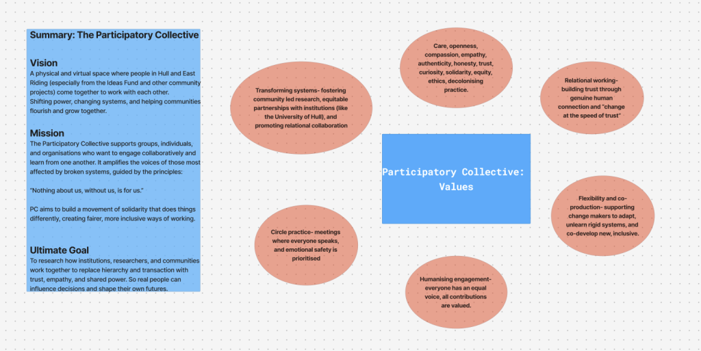 The Participatory Collective is a developing network of community groups, change makers, and individuals across Hull and East Riding who share a belief in working with people, not for them. It brings together those involved with The Ideas Fund and other projects, creating a supportive physical and digital space for collaboration, reflection, and action.