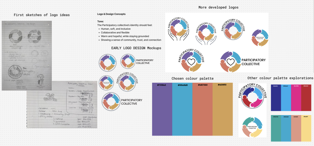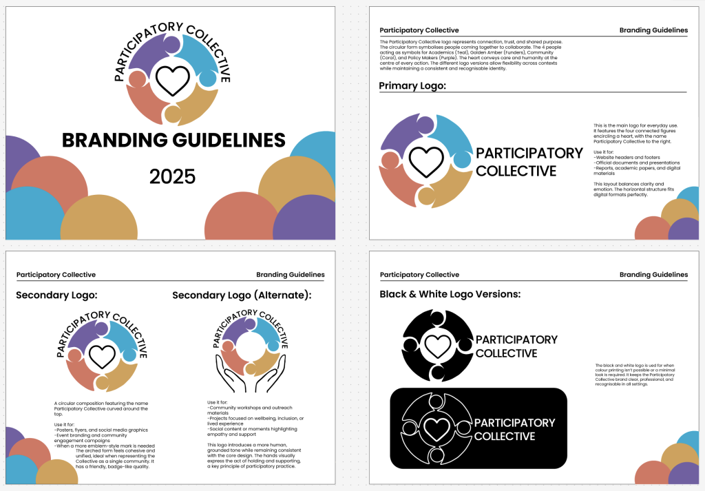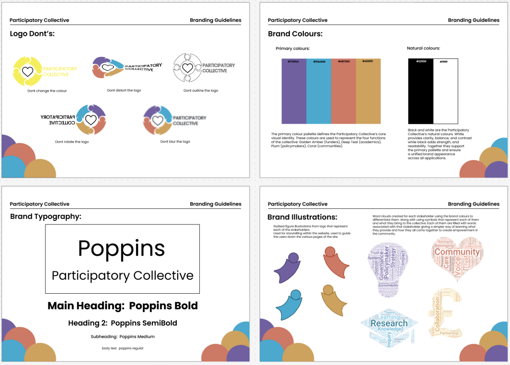 Using these four distinct colours not only helps differentiate the groups visually, but it also reflects the diversity and shared purpose that defines the Participatory Collective. The colours work harmoniously together, giving off a warm, optimistic tone while keeping a balance between professionalism and approachability.