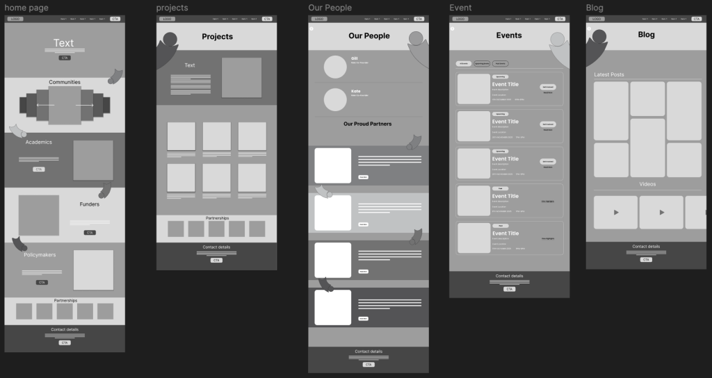 Under the hero section, I included a section for each of the four stakeholder groups which are Community Groups, Academics, Funders, and Policy Makers, along with my figure illustrations which guide the user down the page which are going to be colour co-ordinated to each stakeholder. These groups shape the entire identity of the Participatory Collective, and they are also the foundation of my branding concept. Visually, this section helps users immediately recognise the breadth of people involved in the Collective’s work. Next, I designed a scrollable carousel for Community Groups, this carousel allows users to browse through the different communities involved in the Collective without flooding the page which multiple cards all at once. The rest of the homepage includes sections for Academics, Funders, Policy Makers, and finally an area for the Participatory Collective’s partners and contact details near the bottom having these make the website look more authentic and trustworthy to users since it has connections to other real sites.