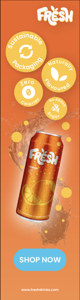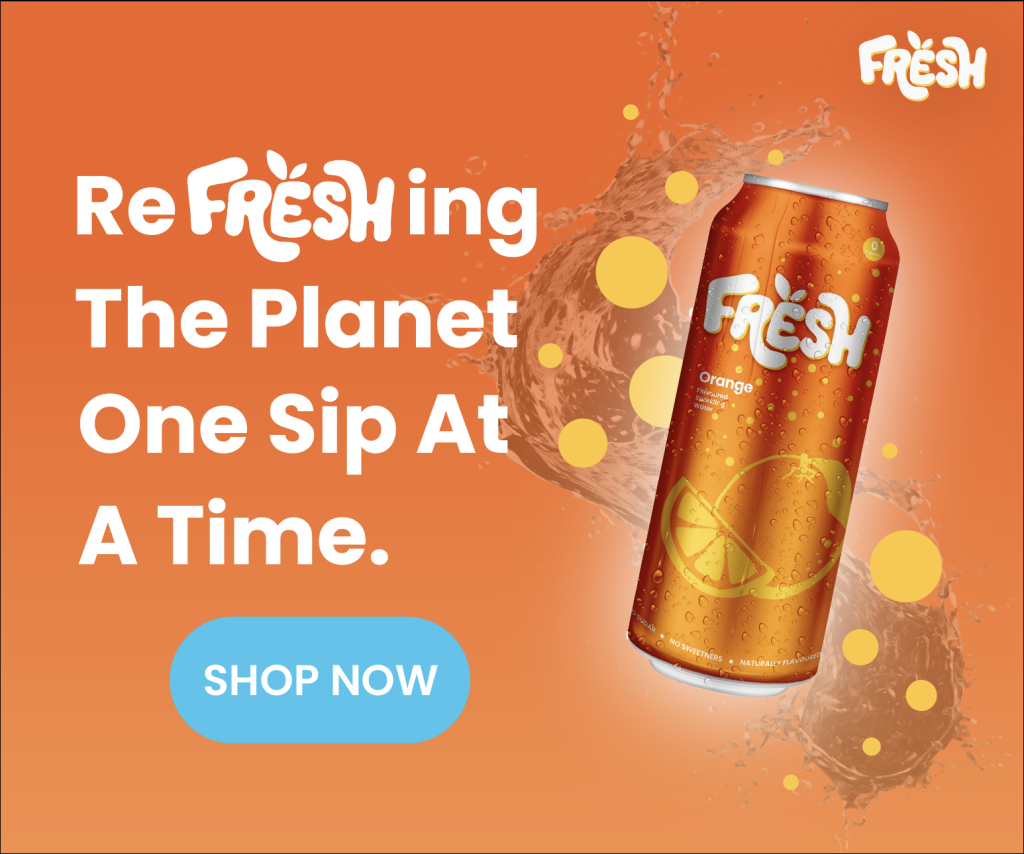 The rectangle banner highlights Fresh’s tagline, “Refreshing the Planet, One Sip at a Time,” paired with a larger, more detailed visual of the can. This format balances both branding and product visibility, making it effective for placements within articles or social platforms. By scaling the can up, the advert reinforces brand recognition while keeping sustainability at the centre of the message.