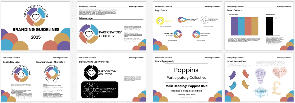 This stage builds on the branding guidelines developed in Assignment 1, refining and applying them consistently across web, mobile, and social platforms. The original brand system established a clear foundation, including primary and secondary logo variations, black and white alternatives, a defined colour palette, a chosen typeface, and a set of illustration elements based around the logo figures. These core elements were carried forward into the high-fidelity prototype to ensure consistency, recognition, and a strong visual identity for The Participatory Collective.